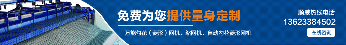 安平縣順威絲網(wǎng)機(jī)械設(shè)備制造有限公司自產(chǎn)自銷,省去中間環(huán)節(jié),讓利給客戶,真正的讓您省錢。主要產(chǎn)品有:萬能勾花(菱形)網(wǎng)機(jī)、縮網(wǎng)機(jī)、自動(dòng)勾花菱形網(wǎng)機(jī)、全自動(dòng)勾花菱形網(wǎng)機(jī)。 |